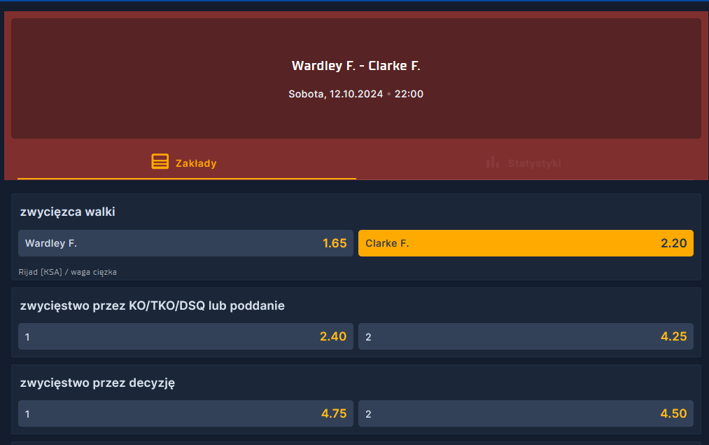 typ: Clarke wygra walkę (2-drogowo, remis = zwrot)
